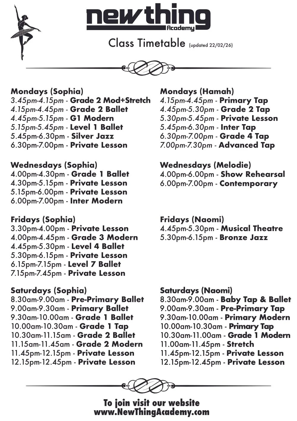 We teach I.S.T.D. Ballet (including Greek, National, Baby Ballet), Tap, Modern/Jazz Dance classes. We currently don't teach Street Dance or Acro.
